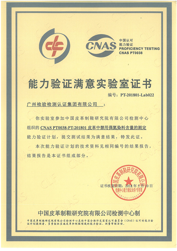近日,广检集团广纺院事业部收到能力验证项目CNAS PT0038-PT-201801“皮革中禁用偶氮染料含量的测定”的结果反馈,获满意结果。