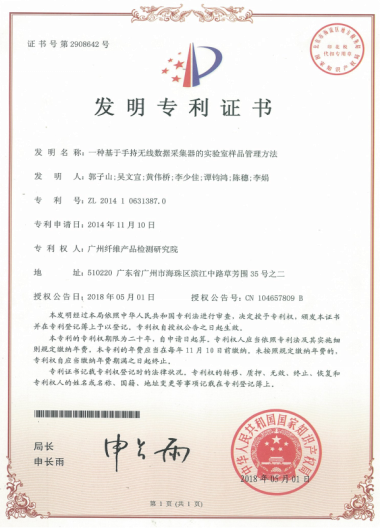 近日,广检集团广纺院事业部申请的一项国家发明专利《一种基于手持无线数据采集器的实验室样品管理方法》获得国家知识产权局授权,专利号:ZL 201410631387.0。