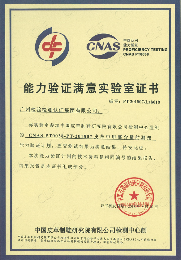 此次能力验证的顺利通过,充分反映了广检集团在皮革甲醛以及鞋类制品的检测方面一直保持着国内先进国际一流的技术能力,能为客户提供精准可靠高质量的检测服务。