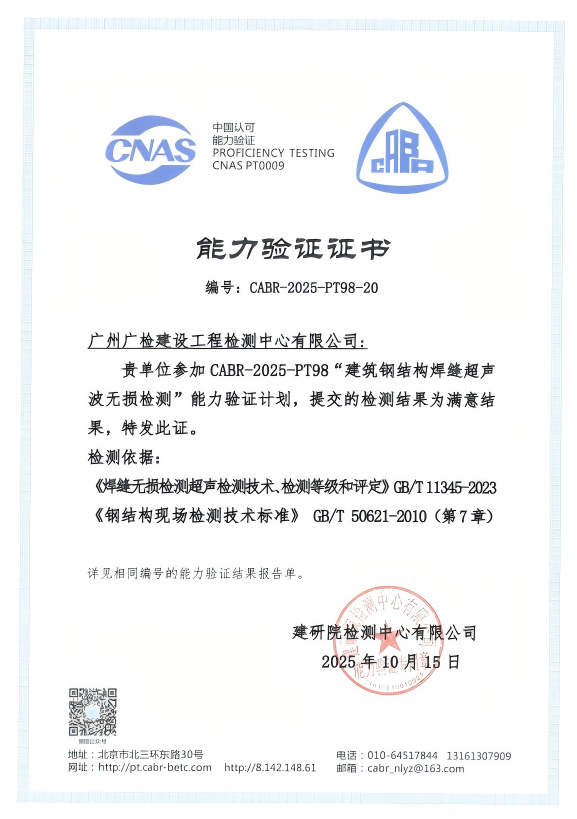 近日,广检工程检测中心在能力验证上连传捷报,先后在CABR-2025-PT132“工程结构实体混凝土强度评定”以及CABR-2025-PT98“建筑钢结构焊缝超声波无损检测”两项能力验证上获得了由建研院检测中心有限公司颁发的满意结果证书,技术实力再获权威认证。