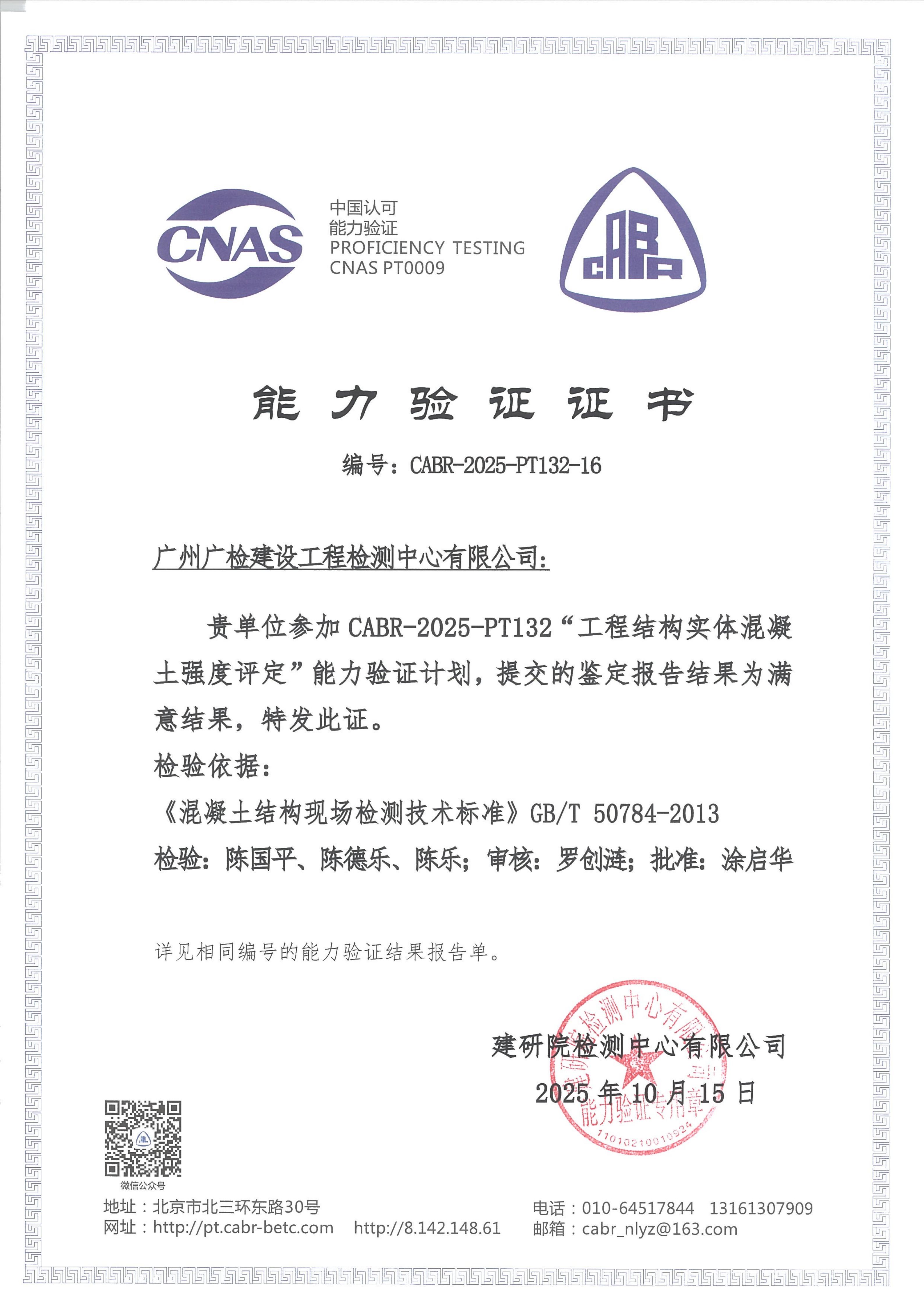 在CABR-2025-PT132“工程结构实体混凝土强度评定”能力验证项目中,广检工程检测中心严格按照《混凝土结构现场检测技术标准》GB/T 50784-2013标准,对混凝土强度进行精准评定。广检工程检测中心凭借专业的技术手段和严谨的工作流程,顺利达成各项评定指标要求,提交的鉴定报告结果获得了“满意”评价,充分展示了其在混凝土强度检测领域的扎实专业能力和可靠技术水平。工程结构实体混凝土强度评定是建筑工程质量控制的关键环节,直接关系到建筑物的安全性和使用寿命。此次验证的顺利通过,不仅是对广检工程检测中心专业能力的有力证明,也为建筑工程质量监督提供了坚实的技术保障。