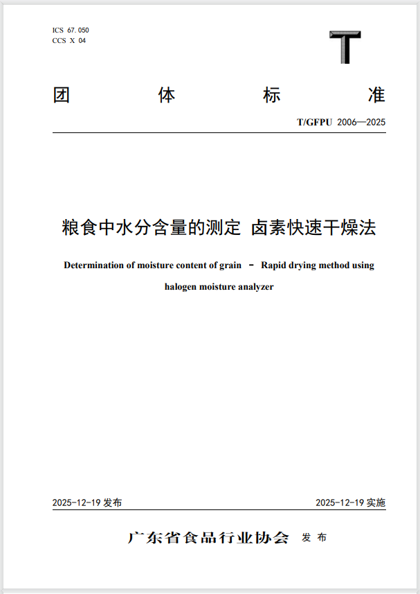 近日,广东省食品行业协会批准发布由广州市穗粮粮油产品质量检测中心有限公司(下称“穗粮检测中心”)联合多家单位共同研制完成的《大米中直链淀粉含量的测定 近红外光谱法》(T/GFPU 2004-2025)、《粮食中水分含量的测定 卤素快速干燥法》(T/GFPU 2005-2025)两项团体标准,并已于2025年12月19日起正式施行。