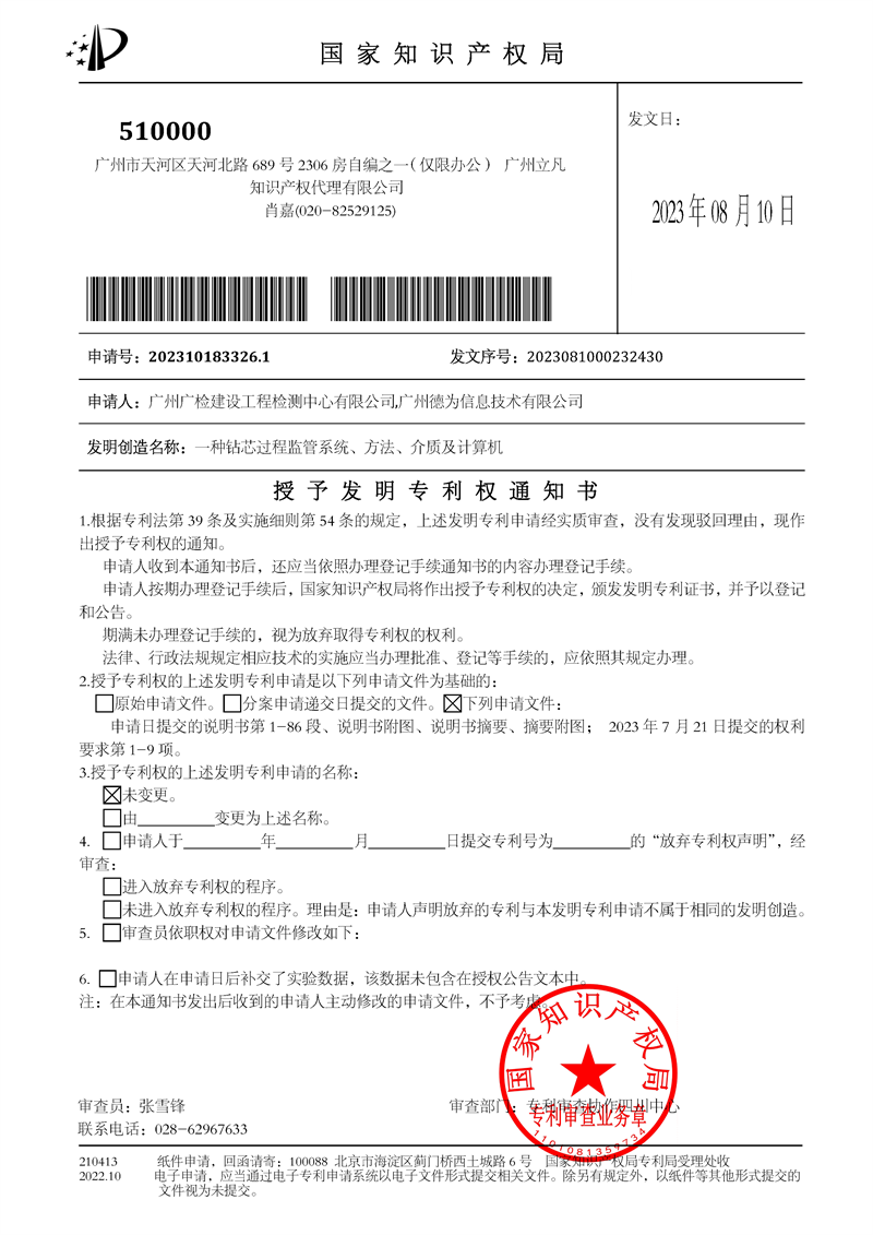 目前,基桩钻芯法检测项目现场实时监控覆盖率达100%,有效保证了基桩钻芯法现场检测的质量和检测数据的真实性、有效性。基桩钻芯法检测报告自动生成系统已成功投入应用,有效提高了检测报告的及时出具率。科研成果方面,该攻关项目实施以来,公司获得授权发明专利2项,实用新型专利2项,计算机软件著作权3项,发表学术论文2篇。
