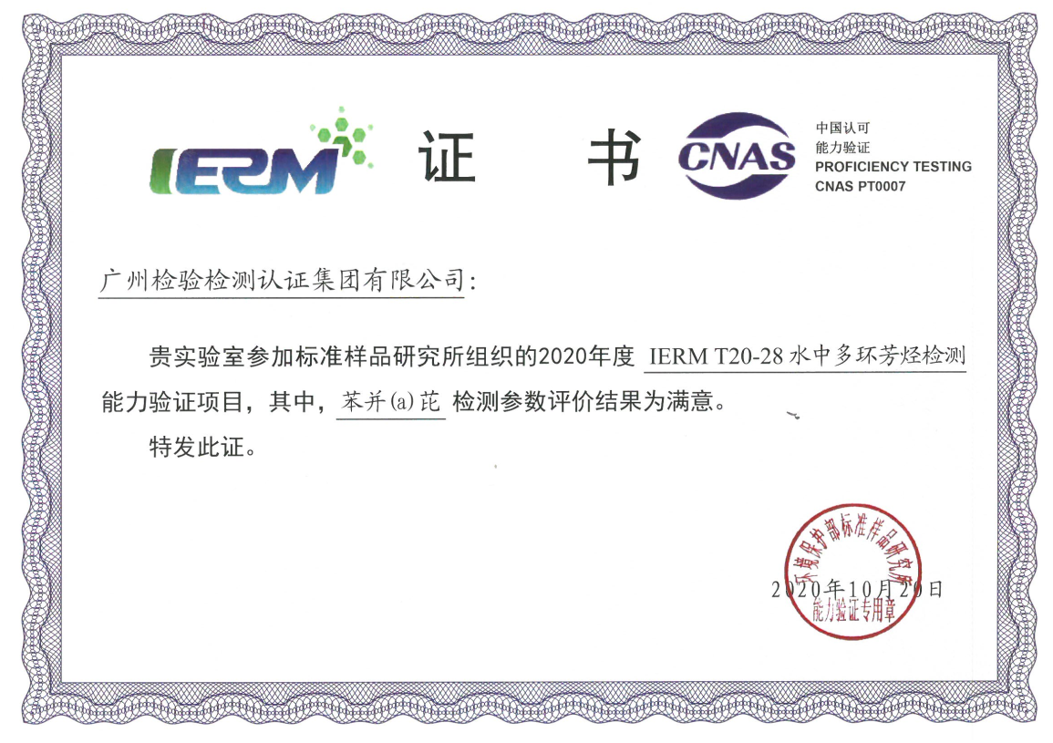 近日,广检集团广科院收到2020年生态环境部标准样品研究所组织的能力验证项目“水中氯化物检测”(IERM T20-27)、“水中多环芳烃检测”(IERM T20-28)的结果反馈,所参加的水中氯化物和水中苯并(a)芘项目均获满意结果。