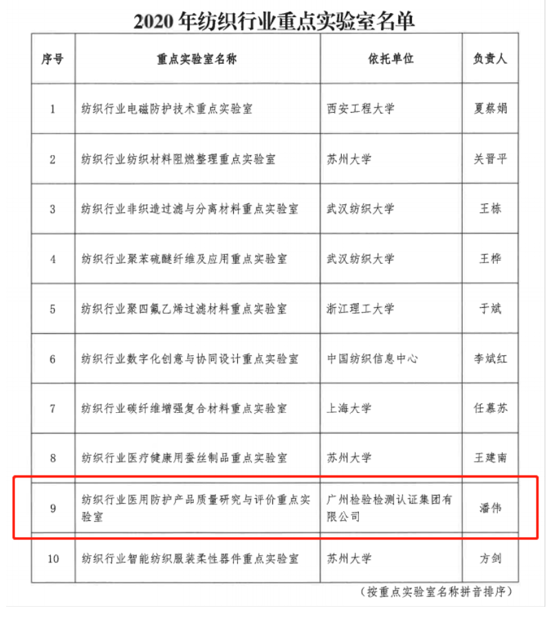 为深入贯彻落实创新驱动发展战略,凝聚纺织技术创新资源优势,推动纺织行业技术创新体系建设,筑牢纺织行业高质量发展的技术基础,2020年10月11日,经中国纺织工业联合会核准认定,广检集团获批纺织行业医用防护产品质量研究与评价重点实验室。