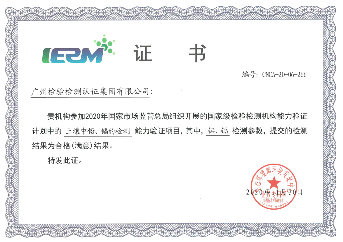 近日,广检集团广科院收到2020年生态环境部标准样品研究所组织的能力验证项目“土壤中重金属检测”(IERM T20-36)及国家市场监管总局组织的国家级检验检测机构能力验证项目“土壤中铅、镉的检测”(CNAS-20-06-266)的结果反馈,所参加的检测项目铜、镉、铅均获满意结果。