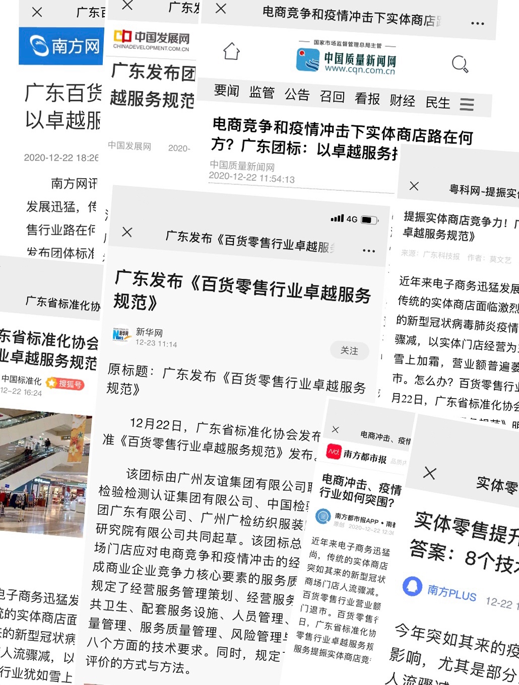 由广检集团参与起草的团体标准《百货零售行业卓越服务规范》于12月22日正式发布!该团标的发布吸引了国内媒体广泛关注,新华网、中国质量新闻网、中国经济导报、中国发展网、广州日报、南方都市报、南方网、广东科技报、腾讯网、搜狐网、新浪网、网易新闻等各大权威、主流媒体争相报道。