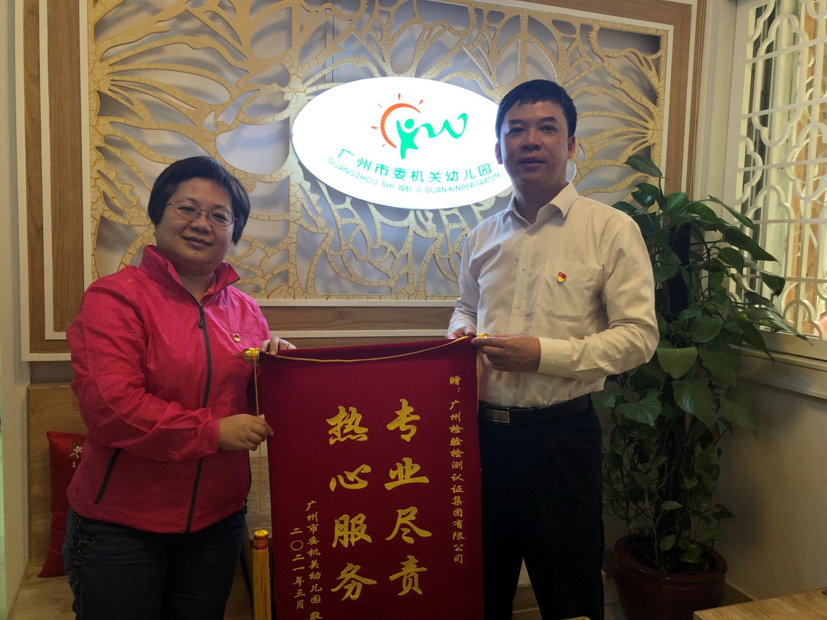 “专业尽责,热心服务”。为感谢广检集团连续两年为广州市委机关幼儿园园内直饮水安全提供高质量的检测服务,3月29日,李智园长代表幼儿园送锦旗致谢,广科院院长/广科公司执行董事、总经理万泉代表集团接受锦旗,并表示为下一代的健康成长服务是我们国企应尽的社会责任。
