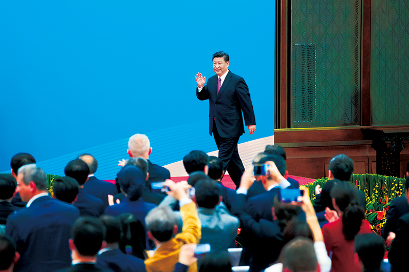 2019年4月27日,第二届“一带一路”国际合作高峰论坛在北京雁栖湖国际会议中心举行圆桌峰会,国家主席习近平主持会议并致开幕辞。圆桌峰会闭幕后,习近平会见中外记者,介绍第二届“一带一路”国际合作高峰论坛圆桌峰会情况和主要成果。这是习近平步入记者会现场。 新华社记者 姚大伟/摄