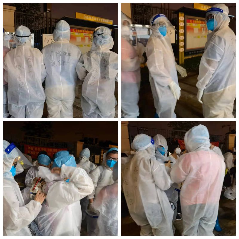 吴文宜说:“穿上防护服,戴上护目镜,衣服一下子就湿透了,结束的时候,手套里都是水,因为特别累,大家坐在台阶上休息了一下,才相互为对方消毒,脱防护服和手套,等待测核酸。”
