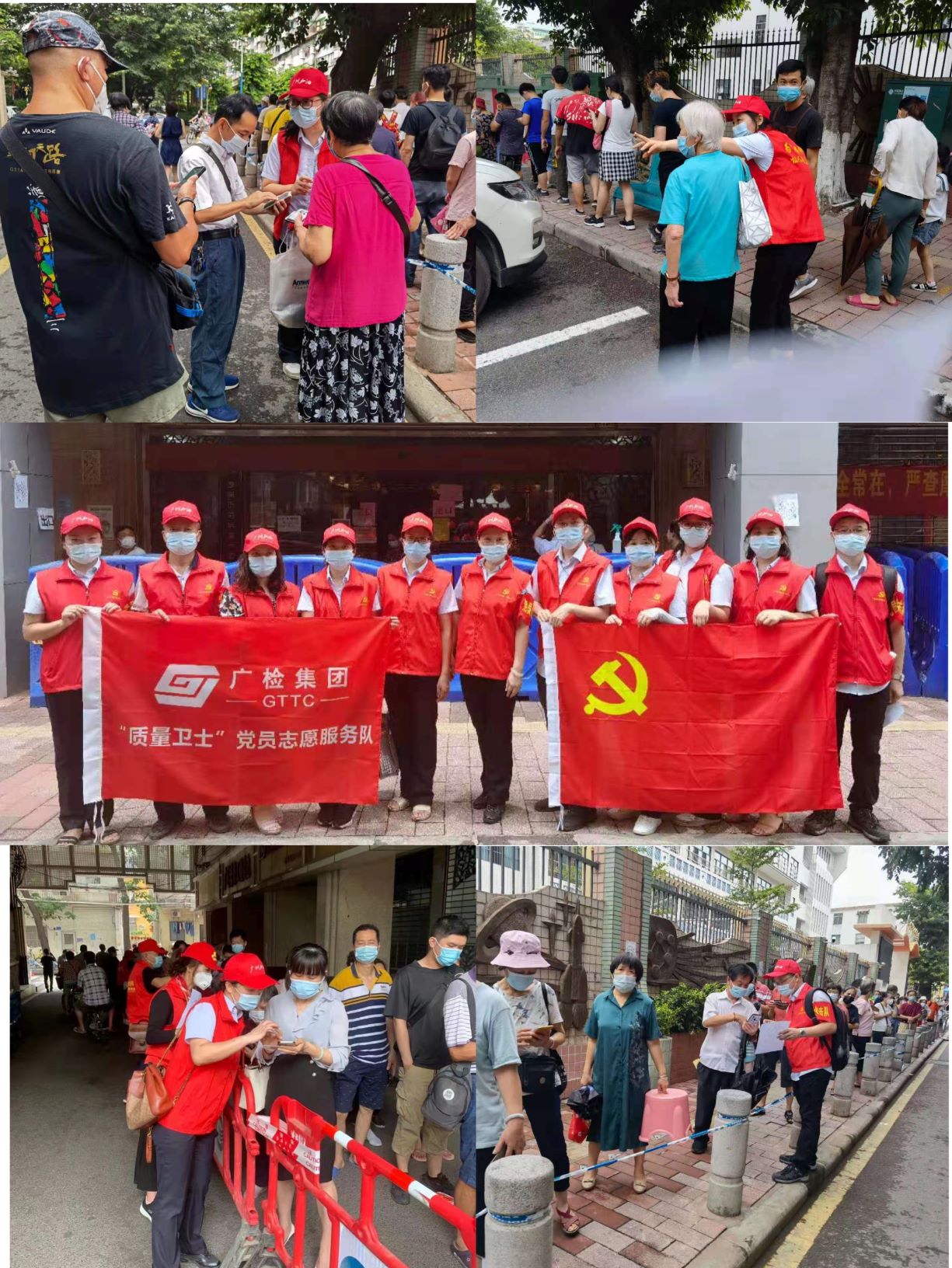 在沙园街党群服务中心,广检集团党员突击队协助社区维持现场秩序,指引排队市民扫描二维码填写信息,耐心解答群众的疑问。“在最短的时间内把人员引导着跟队伍走,不要停留,告知前面还有二维码和工作人员帮忙,这样可以力争等待时间更短一点,取样效率更高。”在忙碌的间隙,队员陈斯佳这样与队友们分享。