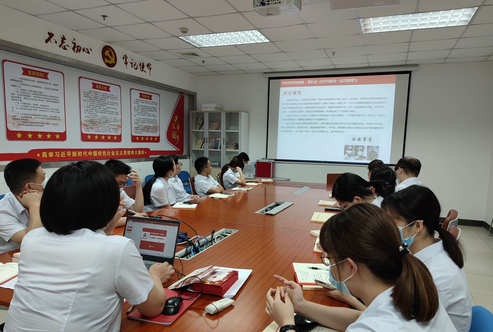 活动首先由刘霞书记作题为《抗日民族统一战线的建立》的专题党课讲解,刘霞书记从建立抗日民族统一战线的时代背景、原因、目的、采取的方法、重要的历史事件和人物等方面,为支部党员生动讲述中国革命历史,对取得革命成功的重要法宝之一的“统一战线”做了深入的剖析,使广大党员深刻了解到中国革命胜利来之不易,中国人民能摆脱受压迫剥削的命运来之不易,中华民族能从站起来、富起来、再到强起来的梦想来之不易。作为当代的知识青年,我们要如习近平总书记期望的那样,重视党史学习教育,用党的奋斗历程和伟大成就鼓舞斗志、明确方向、砥砺品格。