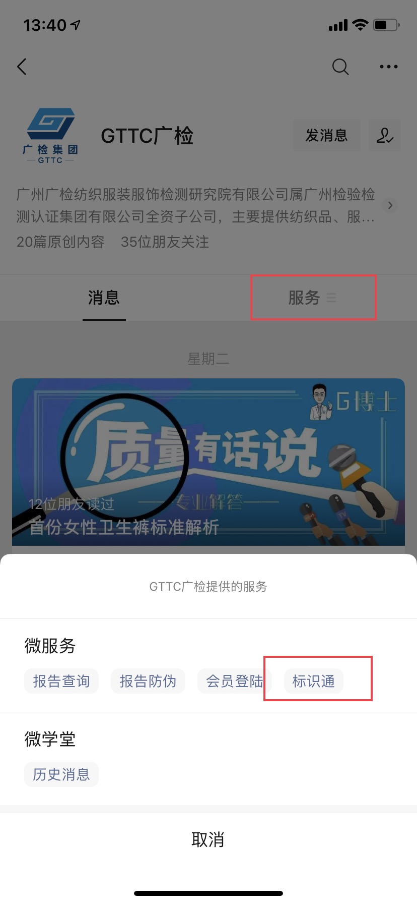 1.在微信搜索公众号“GTTC广检”,关注公众号后,进入公众号。