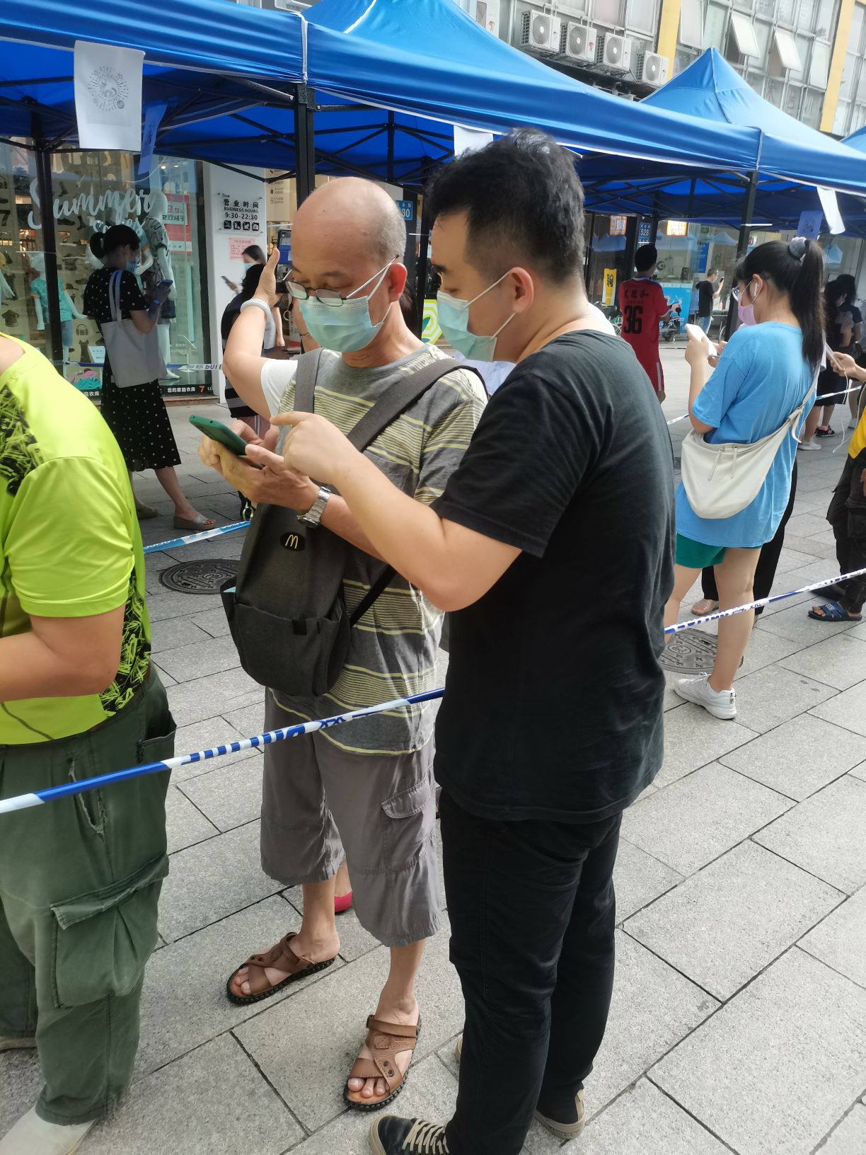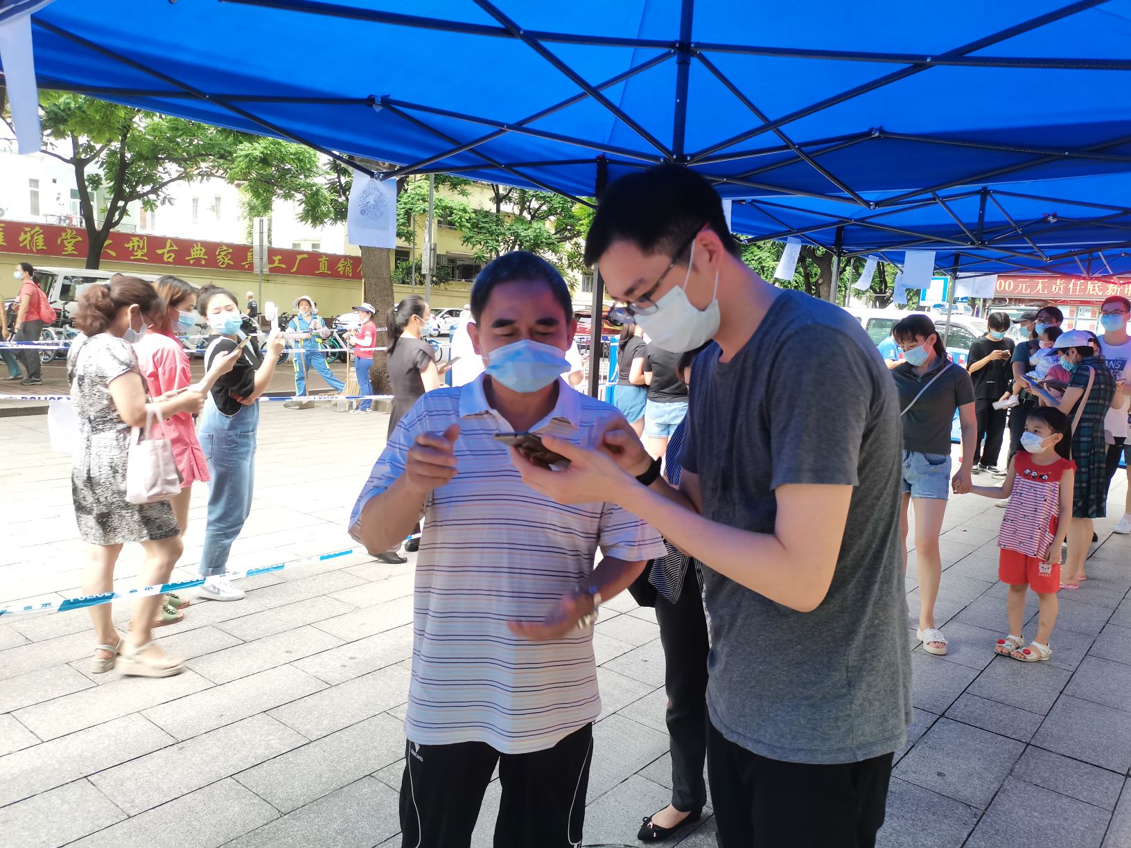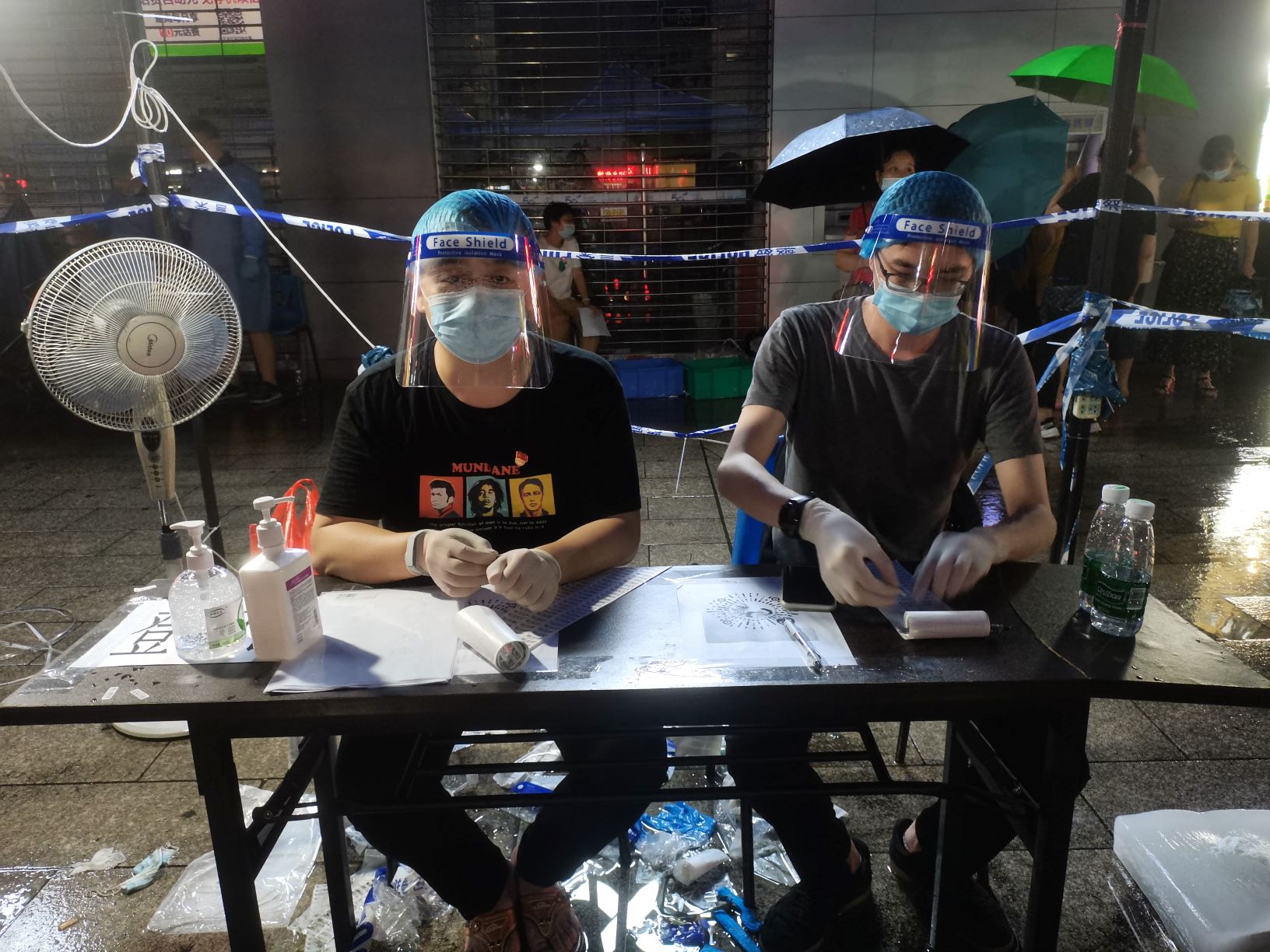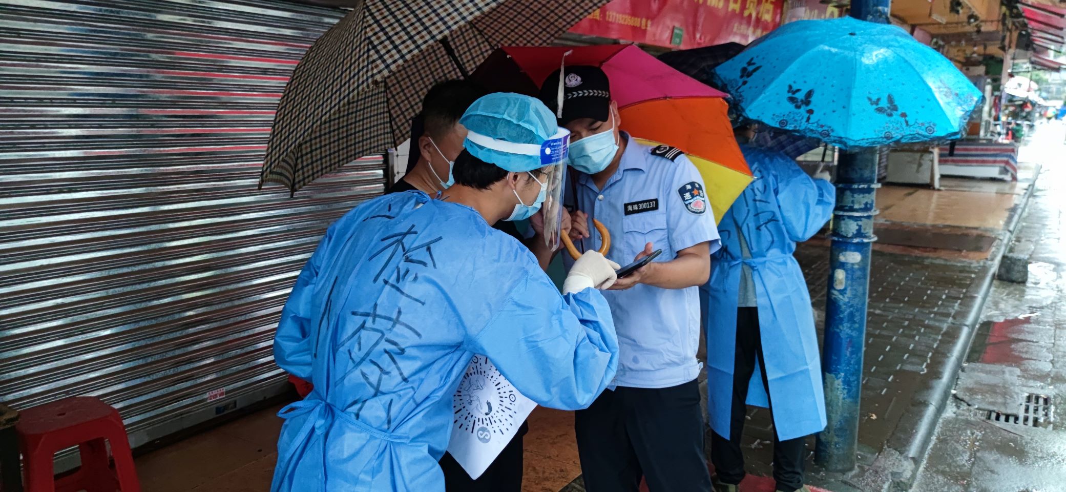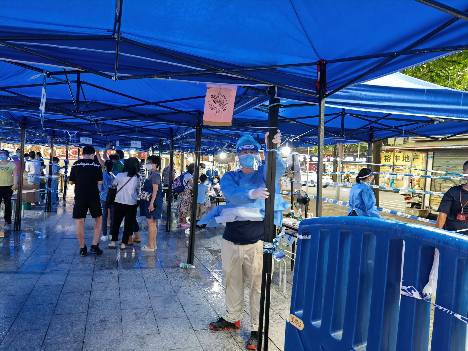 6月1日,广检工程检测中心温小凡、肖云鹂、蔡旭颖、李家祺四位同志又加入到集团青年志愿者突击队,分两批支援海珠区江南苑和沙园核酸检测点工作。当天的工作又遇到了暴雨袭击,但大家无所畏惧,坚守工作岗位。温小凡在大暴雨中一直用双手支撑着沙园核酸测试点入口处的帐篷,用自己的身体为群众遮风挡雨,而自己全身上下浸透了雨水和汗水。