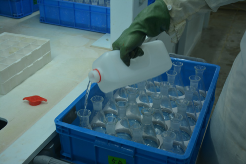 由于高浓度硫酸对人体皮肤、粘膜等组织有强烈的刺激和腐蚀作用,人工分液劳动强度高、试剂浪费现象多、操作过程较危险、人工成本高、废液处理费用高等,广纺院自主研发了75%浓硫酸自动加液系统,可批量完成加液工作,且加液量准确度高。该设备每天大约可节约30分钟检验用时,切实提高检验效率,保障操作人员的安全。