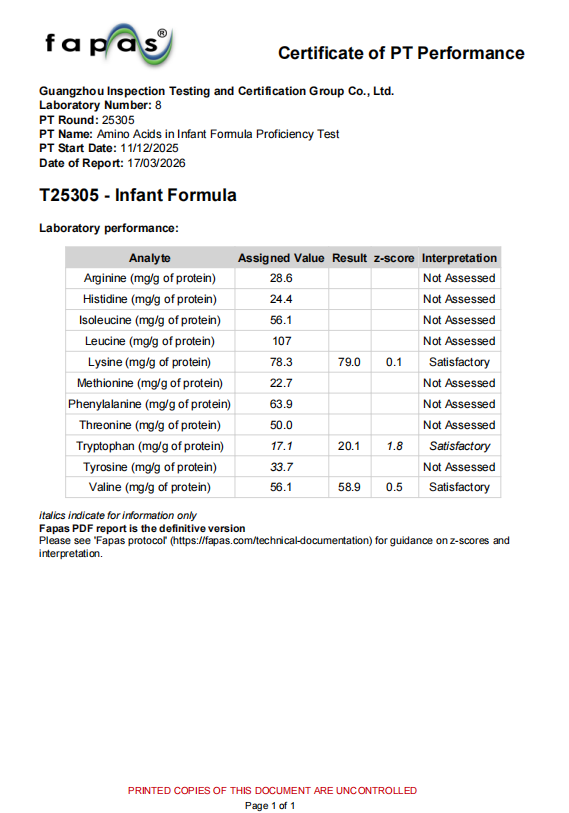 氨基酸是婴幼儿生长发育的关键营养素,其含量是评价乳粉品质的重要指标之一。此次在国际权威能力验证中取得满意的结果,充分证明了广检集团在食品营养成分检测领域,尤其在技术难度大、社会关注度高的婴幼儿食品检测方面,具备扎实的技术功底、可靠的质量体系和卓越的检测能力。这不仅是对广检集团技术实力的权威认可,也为保障婴幼儿食品的质量安全提供了更坚实的技术支撑。