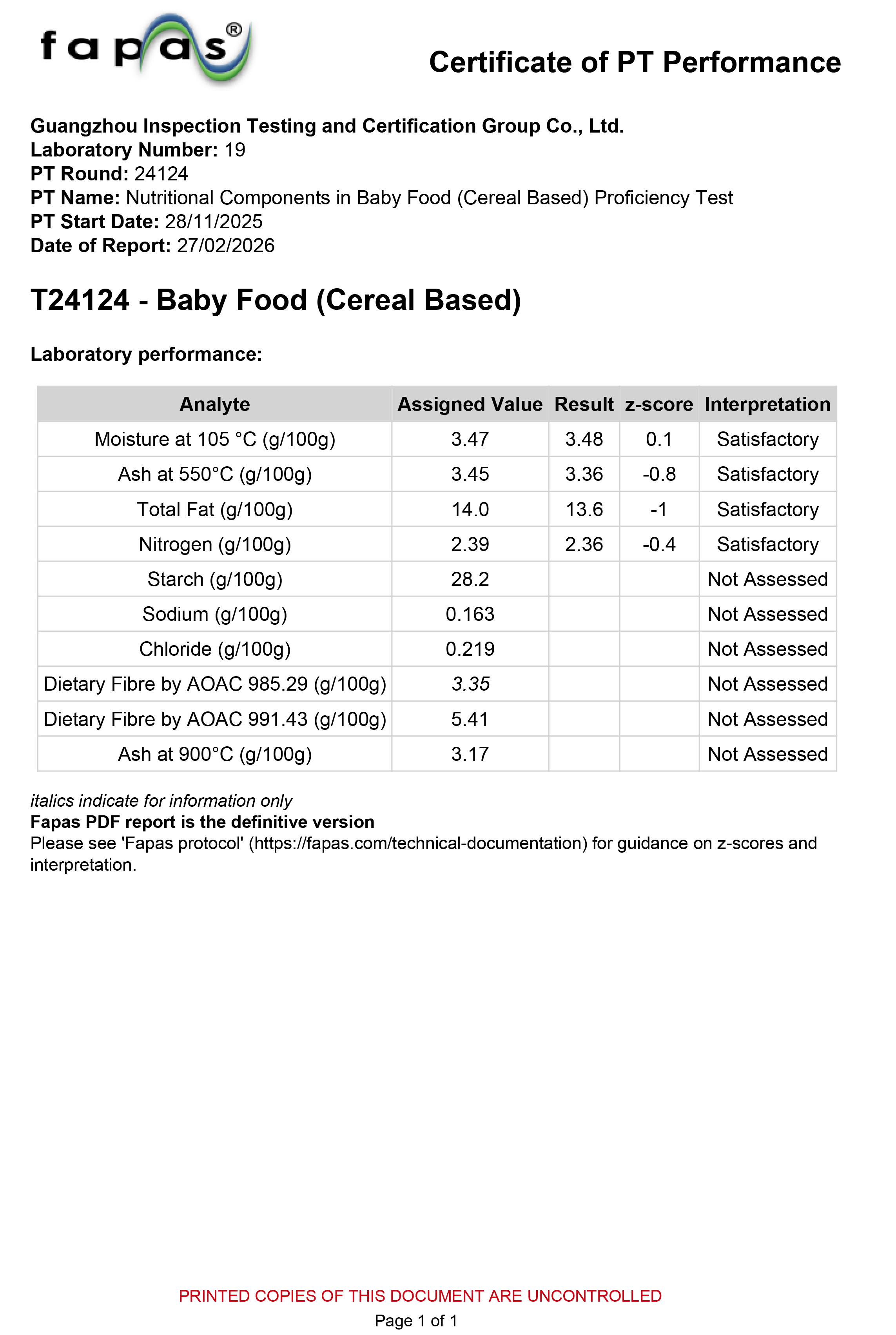 近日,广检集团收到来自英国Fapas(食品分析能力评价体系)的能力验证报告,显示我机构在“婴幼儿谷物辅助食品中基础营养成分测定(Baby Food (Cereal Based) Test Material)”国际能力验证中的评价为“满意”,参加项目的|Z|值均远低于2.0的满意限评价要求,这标志着广检集团在婴幼儿谷物粉营养成分测定方面已达到了国际先进水平。