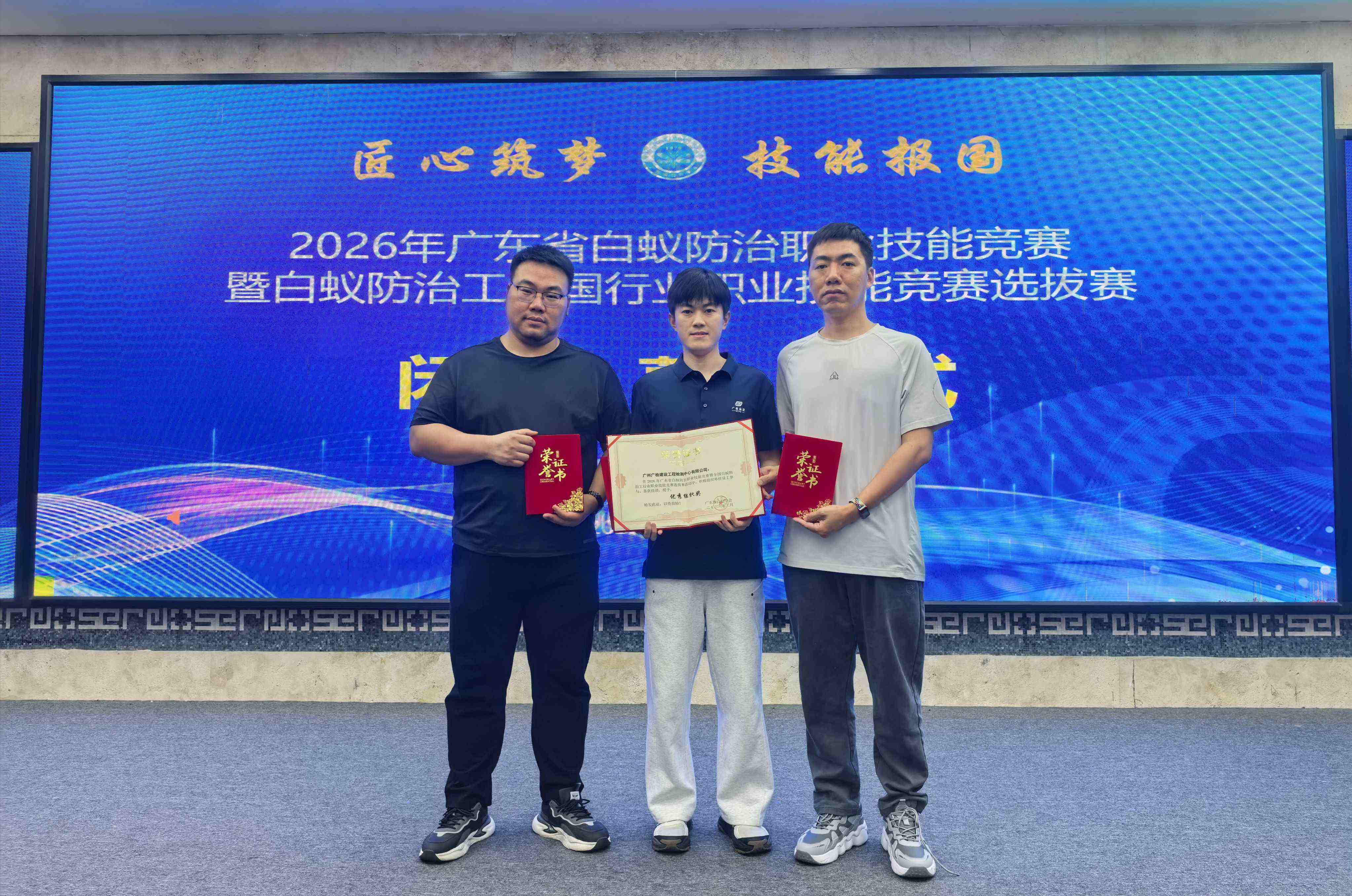 为深入贯彻习近平总书记对技能人才工作的系列重要指示精神,大力弘扬劳模精神、劳动精神、工匠精神,3月24日,由广东省白蚁学会主办、中山市建筑业协会承办的2026年广东省白蚁防治职业技能竞赛暨白蚁防治工全国行业职业技能竞赛选拔赛顺利举行。赛事中省内多家白蚁防治机构同台竞技,切磋交流。广检工程检测中心表现突出,斩获优秀组织奖,选手孔维贞、梁嘉威、梁梓豪分别获个人一等奖、二等奖、三等奖。孔维贞还获得了代表广东省征战全国行业职业技能竞赛的资格。