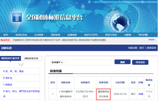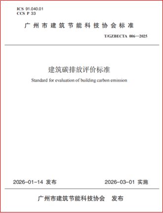 2026年3月,由广检工程检测中心联合广州华森建筑与工程设计顾问有限公司、西安建筑科技大学主编的广州市建筑节能科技协会团体标准——《建筑碳排放评价标准》(T/GZBECTA 006—2025)正式在全国团体标准信息平台上线并全面实施!