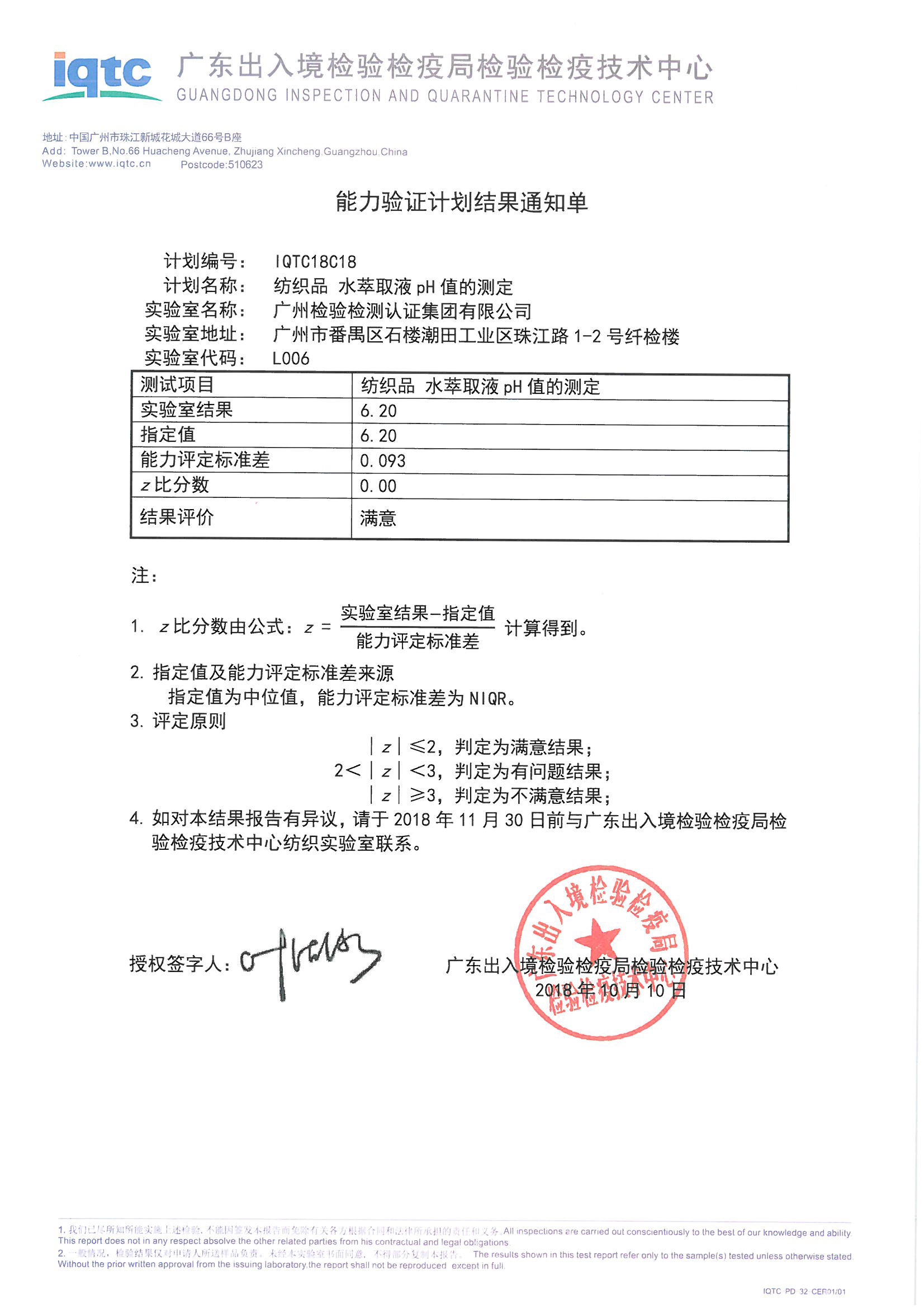 近日,广检集团收到IQTC18P17“纺织品 织物拉伸性能断裂强力的测定(条样法)”、IQTC18C18“纺织品 水萃取液pH值的测定”两项能力验证的结果反馈,均获满意结果。