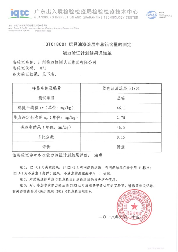 此次能力验证的顺利通过,充分反映了广检集团在玩具检测领域具有国内先进国际一流的技术能力,能为客户提供精准可靠高质量的检测服务。
