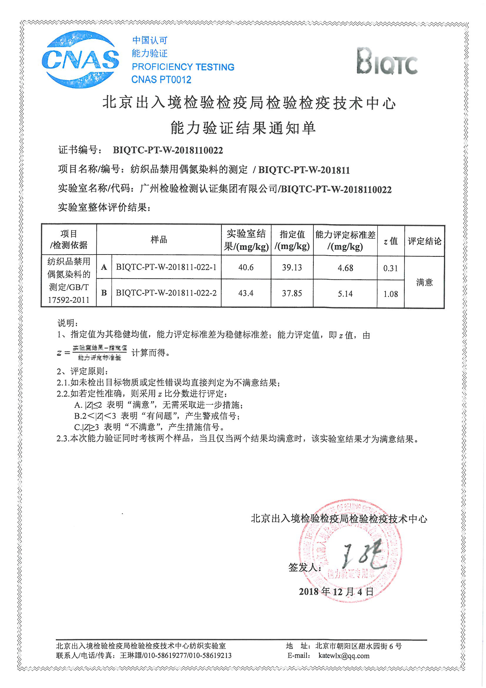 近日,广检集团收到能力验证项目BIQTC-PT-W-201805“纺织品可萃取重金属的测定”、BIQTC-PT-W-201811“纺织品禁用偶氮染料的测定”的结果反馈,评价结果均为满意。