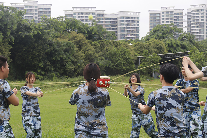 拓展培训中,员工分组合作保持平衡,不让球从鼓面飞离