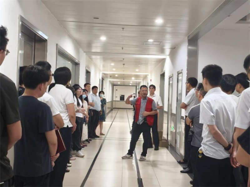 随着警报系统信号的发出,消防演练活动组织人员立即启动应急响应,全体演练人员听从指挥,弯腰、护头、掩鼻,按照疏散路线,从就近疏散楼梯向下,快速有序疏散至指定的疏散区域。