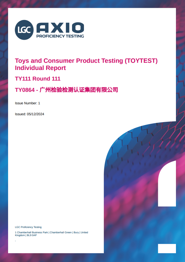 近日,广检集团收到英国LGC AXIO组织的“塑料制品的燃烧性能(真实玩具产品)”能力验证结果反馈,广检集团获满意结果。
