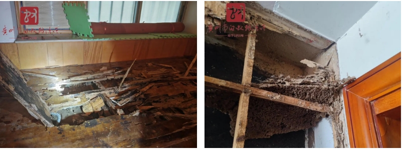 -若发现大量从室内向外飞的分飞蚁或疑似蚁害痕迹,切勿使用杀虫剂喷洒、灌注开水或火烧等方式处理,以免惊扰白蚁,导致其扩散,扩大危害范围。可立即联系广州市白蚁防治所(沿江西路门店咨询电话:020-81886779),切勿自行破坏蚁路和蚁巢。