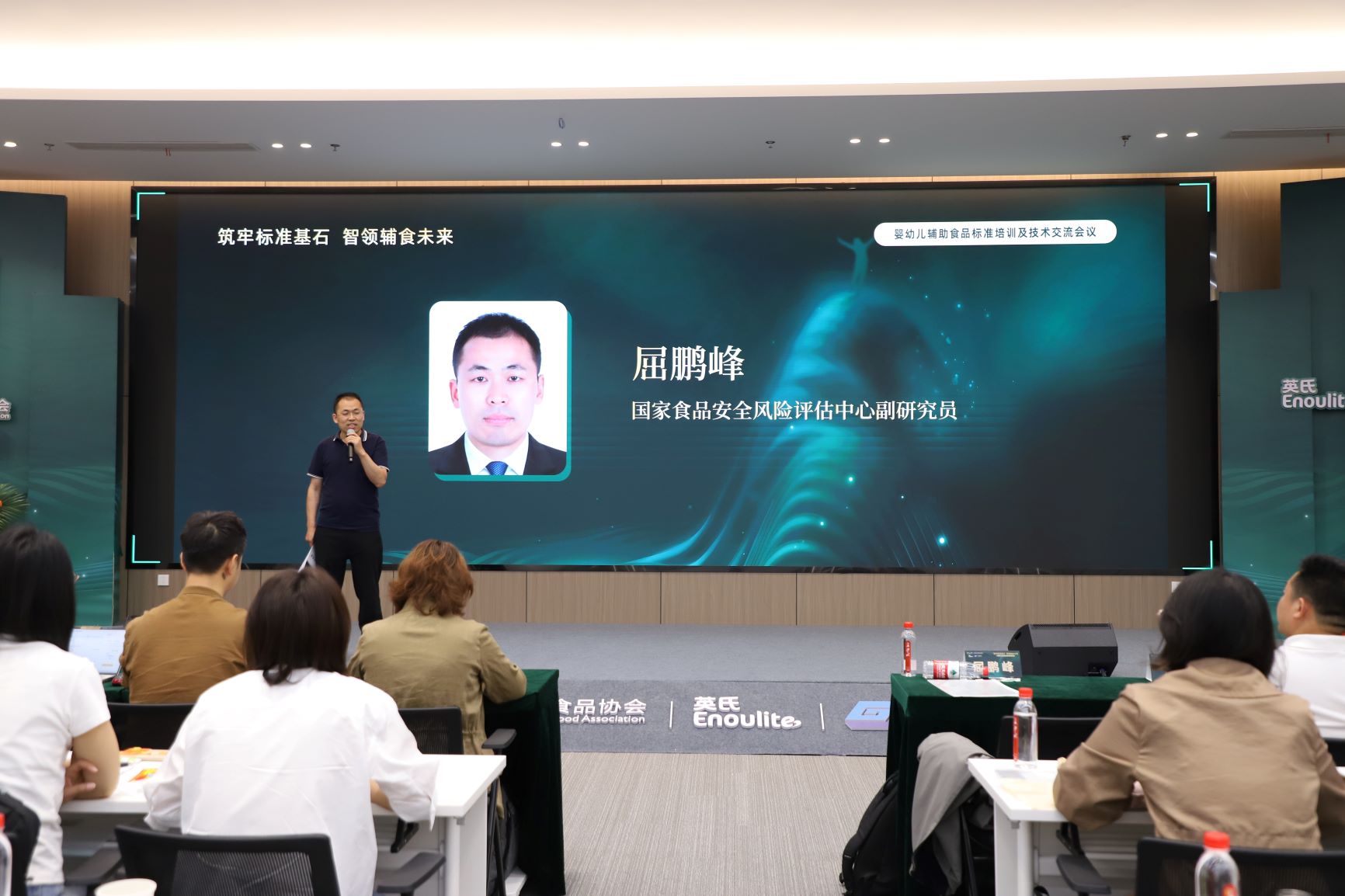 本次会议的专家包括中国营养保健食品协会副秘书长郝斌、婴辅专委会主任委员蔡玮红、国家食品安全风险评估中心副研究员屈鹏峰、广检集团广质院院长助理曾绮莹以及英氏集团质量管理部部长赵涛。会议吸引了来自全国各地的婴幼儿食品生产企业、检测机构及科研单位的100多名代表。