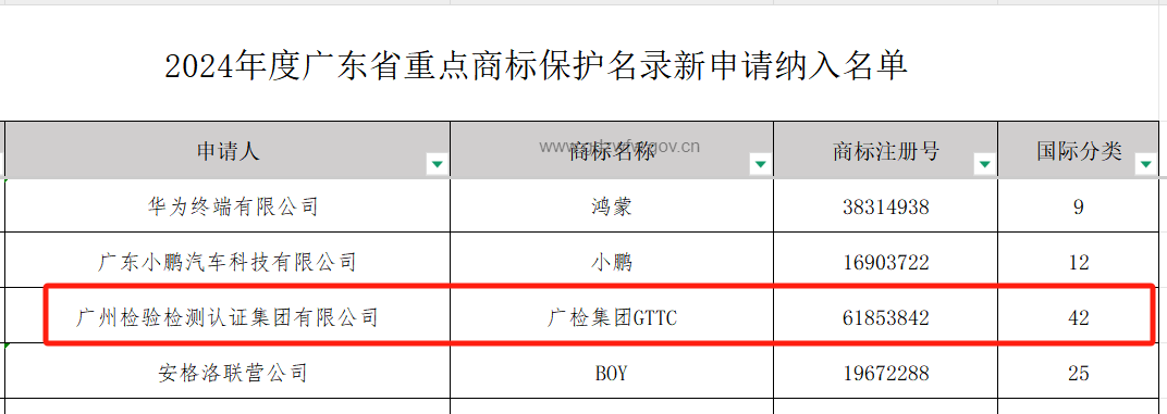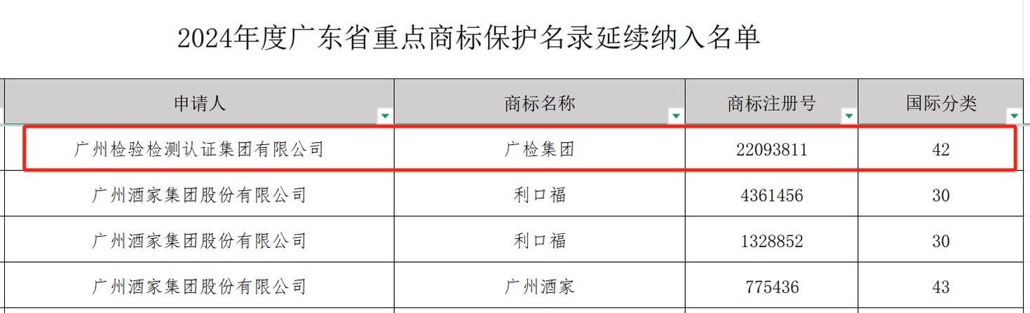 近日,广检集团凭借其在检验检测认证领域的卓越表现和市场声誉,再次获得官方认可:其横版组合商标“广检集团”与“鸿蒙”“小鹏”等376件商标一同纳入《广东省重点商标保护名 录》 , 其文字商标“ 广检集团”与“QQ”“广汽”等292件商标延续纳入《广东省重点商标保护名录》,截至目前,广检集团已有3件核心商标成功入选,这不仅是对广检集团多年来在品牌建设、知识产权保护方面努力的认可,也是对其在提升品牌价值、增值企业无形资产方面所取得成果的肯定。