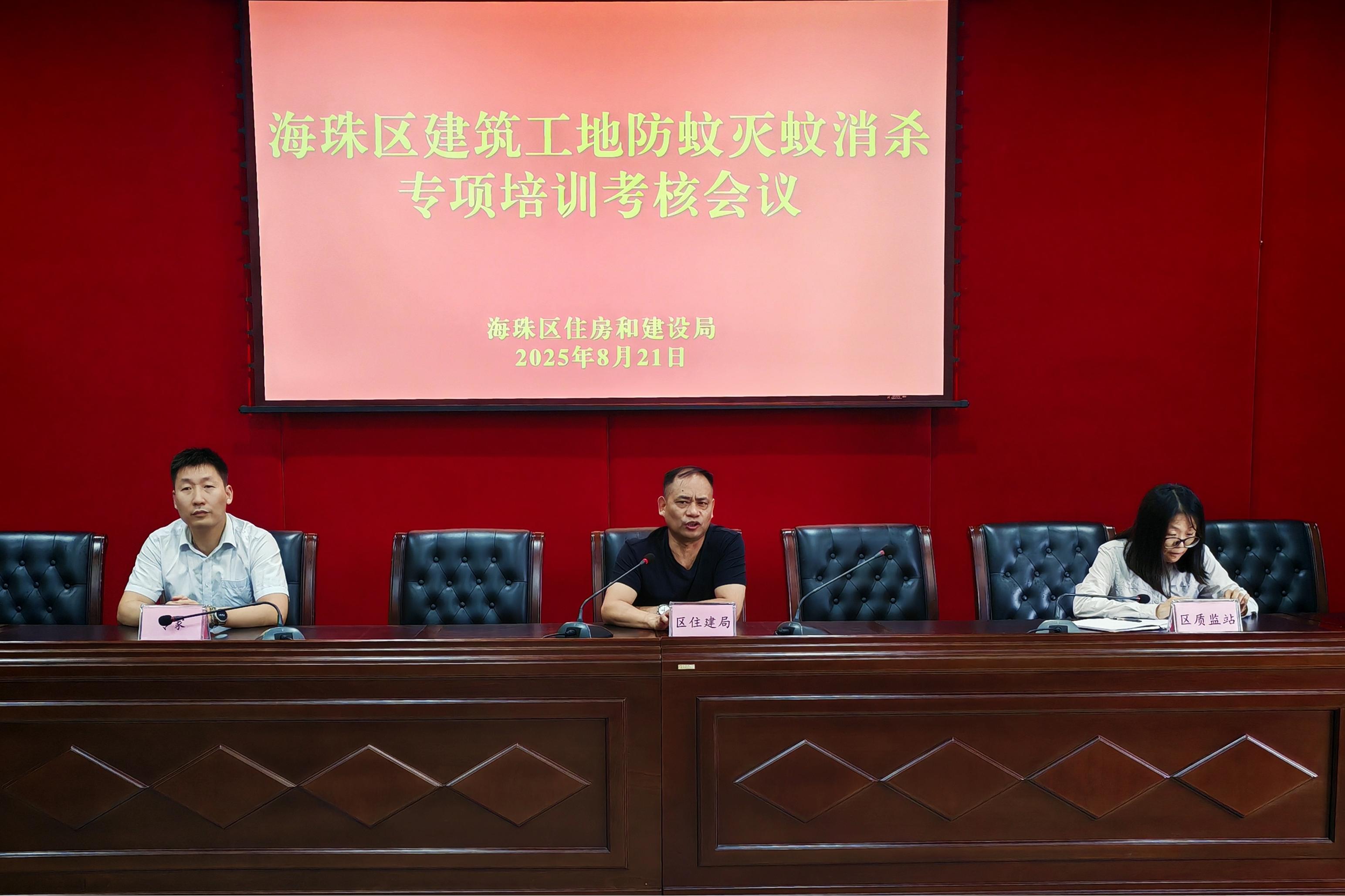 为深入贯彻落实市区关于 “两热” 防控的工作部署,切实提升蚊媒孳生地清理能力,确保各工地 “两热” 防控工作落实到位,8月20日,广州市海珠区住房和建设局(以下简称“区住建局”)对区内建设工地施工单位项目经理、安全总监等相关人员开展首批防蚊灭蚊消杀专项培训考核。广检工程检测中心白蚁防治所(原广州市白蚁防治所)受邀承担此次培训任务。