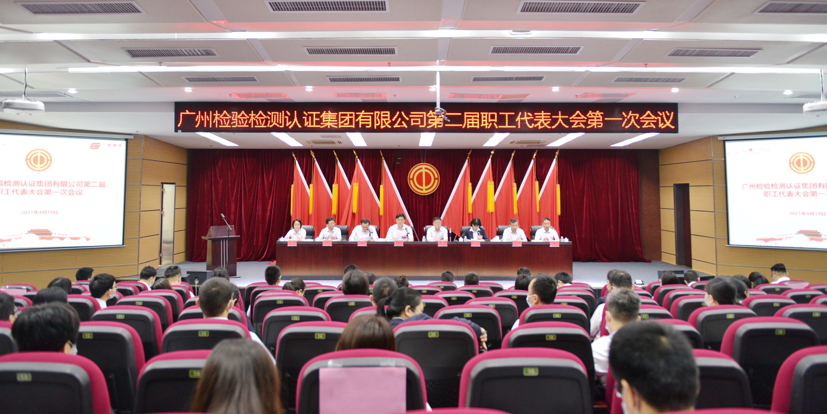 2021年4月19日上午,广州检验检测认证集团有限公司第二届职工代表大会第一次会议在番禺园区胜利召开。广检集团党委书记、董事长蔡依军,党委副书记、总经理、副董事长黄勇等领导及代表80人参加大会。大会由广检集团党委副书记、董事、工会主席王世基主持。