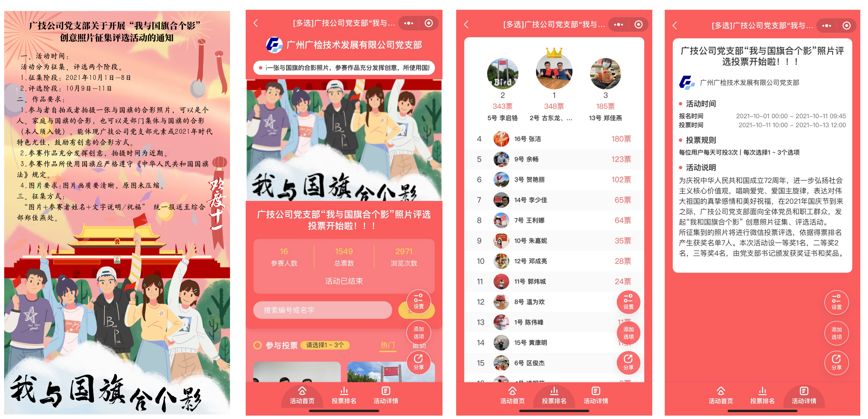 活动分为征集、评选两个阶段。10月1日-10日,党员、职工群众通过自拍、合影、发送祝福语等方式,表达对祖国母亲的真挚感情和美好祝福;10月11日-13日,16个参赛作品进入线上投票环节,累计获得2971次浏览关注、1549人次投票。根据活动评选规则,总票数排名前7的古东龙和黄伟潮、李启铬、郑佳燕、张洁、余畅、贺艳丽、李少佳获得党支部颁发的荣誉证书和精美礼品一份。