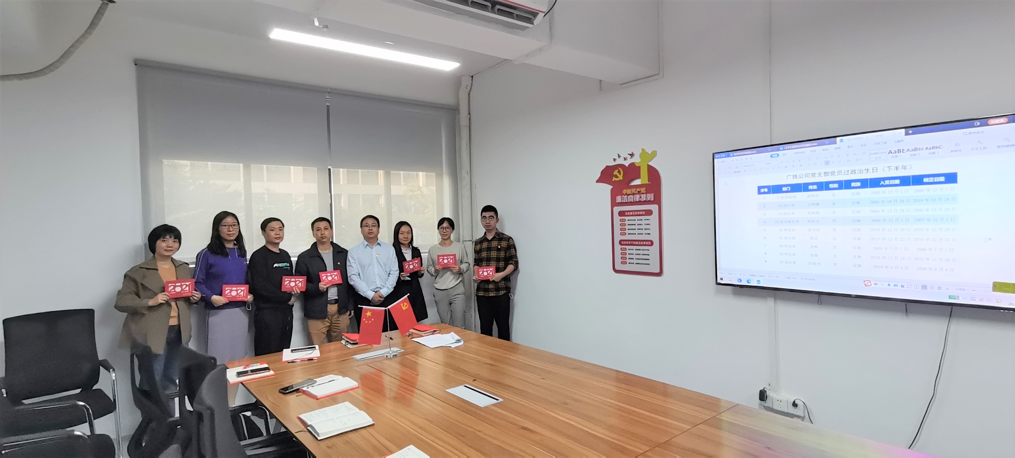 随后,广技公司开展以“加强政策理论学习,集体过政治生日”为主题的党日活动。综合部党员李启铬、组织宣传委员王利娜分别领学了《中国共产党党徽党旗条例》、《广州检验检测认证集团有限公司“十四五”(2021-2025年)发展规划》,了解党徽党旗使用和管理的有关内容,同时充分领会集团“十四五”规划的战略目标。全体党员一起朗读了《广检集团党员干部应知应会》节选,并共同为入党时间为下半年的党员集体过政治生日,送上生日寄语。