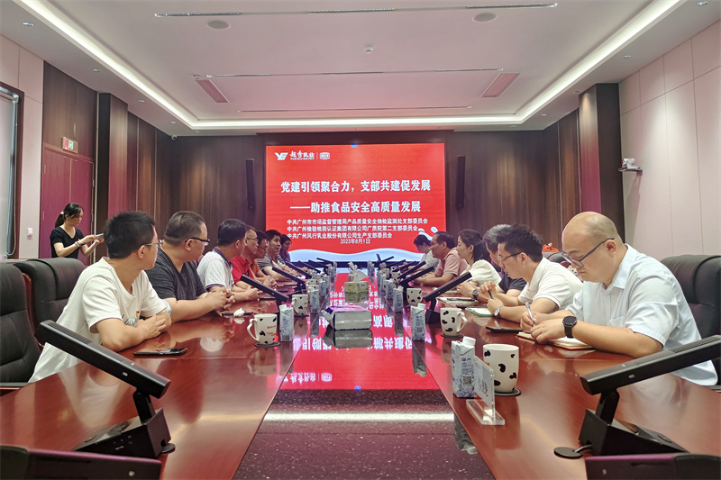 为贯彻党的二十大精神和习近平总书记对广东系列重要讲话、重要指示精神,贯彻落实全省高质量发展大会精神,推动广州高质量发展干在实处、走在前列,8月1日,由广检集团党委副书记、董事王世基带队,中共广州检验检测认证集团有限公司广质第二支部委员会(简称广质第二党支部)与中共广州市市场监督管理局产品质量安全抽检监测处支部委员会(简称抽检处党支部)、中国共产党广州风行乳业股份有限公司生产支部委员会(简称风行乳业生产党支部)开展党支部共建活动。