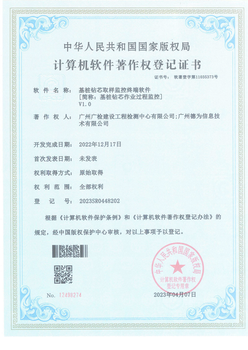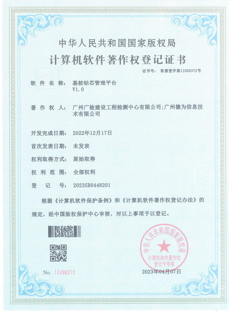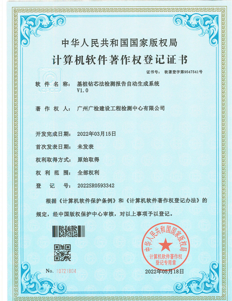 目前,基桩钻芯法检测项目现场实时监控覆盖率达100%,有效保证了基桩钻芯法现场检测的质量和检测数据的真实性、有效性。基桩钻芯法检测报告自动生成系统已成功投入应用,有效提高了检测报告的及时出具率。科研成果方面,该攻关项目实施以来,公司获得授权发明专利2项,实用新型专利2项,计算机软件著作权3项,发表学术论文2篇。