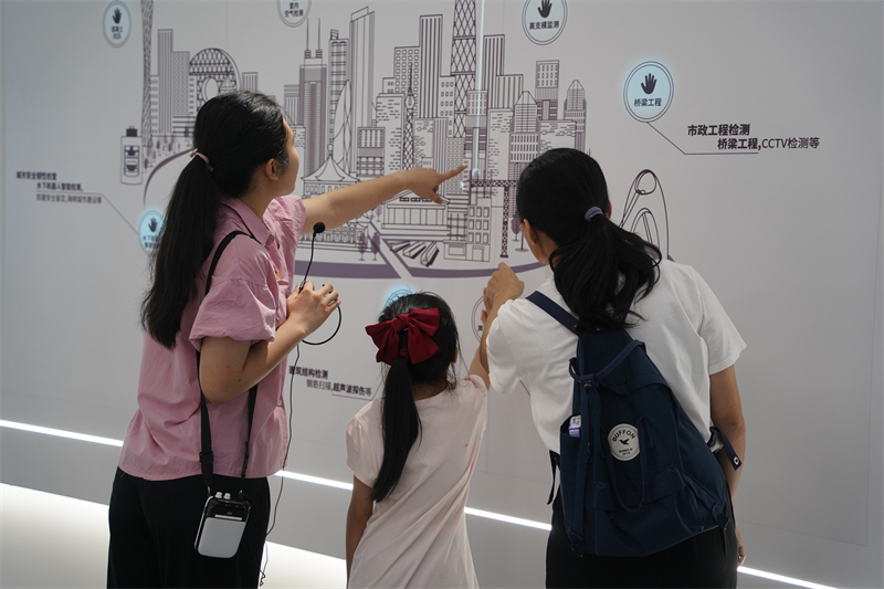 担任讲解员的党员向职工子女讲解绿色建材产品、建设工程质量检测、园林树木常见蛀干害虫及白蚁防治等相关知识,带领他们走进智能化实验室,近距离了解智能化检测技术,传递热爱科学、崇尚科学的观念。职工家属及子女认真听讲,并就自己感兴趣的问题进行提问,积极参与互动交流,现场气氛热烈。