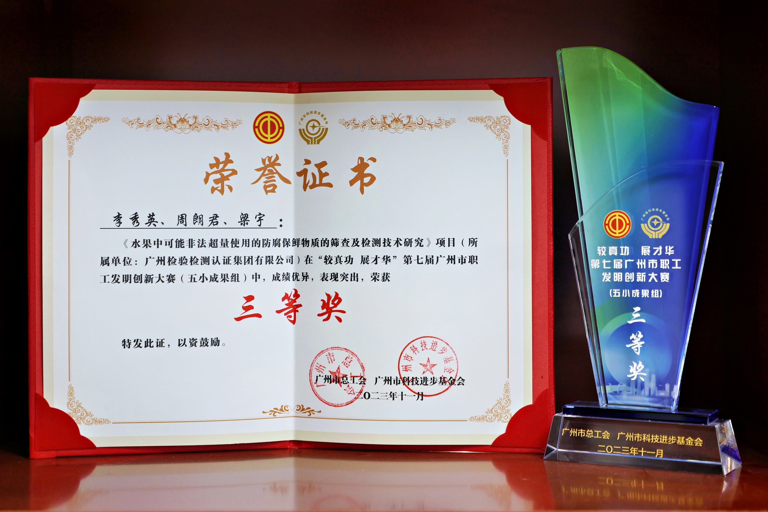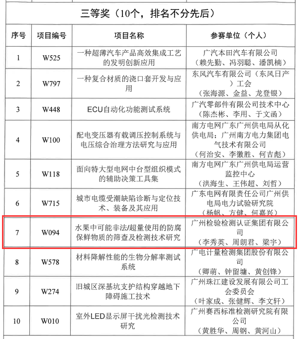 11月17日,由广州市总工会、广州市科技进步基金会主办的“较真功 展才华”第七届广州市职工发明创新大赛颁奖仪式在琶洲广交会展馆举行。由广检集团广质院“梁志森创新工作室”团队成员李秀英、周朗君等人主持研究的《水果中可能非法/超量使用的防腐保鲜物质的筛查及检测技术研究》创新项目,喜获第七届广州市职工发明创新大赛(五小成果组)总决赛三等奖!