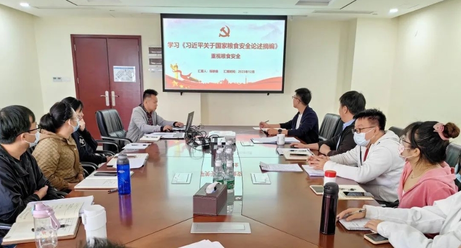 党课上,陈轶雄同志首先以《摘编》中专题之一“粮食安全是‘国之大者’,中国人的饭碗要牢牢掌握在自己手中”为总则,深刻阐释了在新时代新征程上“要把牢粮食安全主动权”的历史使命,以及政治、理论、和实践意义。随后通过分析我国粮食安全面临的主要问题和风险,讲述了在当前世界百年未有之大变局下国际环境的复杂性。最后阐述了我国在迈上强国建设、民族复兴新征程的时代背景下,我们深入学习贯彻落实习近平总书记关于粮食安全的重要论述,对于确保我国粮食安全、促进高质量发展和高水平安全的良性互动,具有十分重要的意义。穗粮公司作为粮油检测的第三方检验检测机构,在业务承揽及实施过程中要严格按照粮食质量安全标准把关粮食的质量安全,守住管好“大国粮仓”,为保障国家粮食安全做出应有贡献。