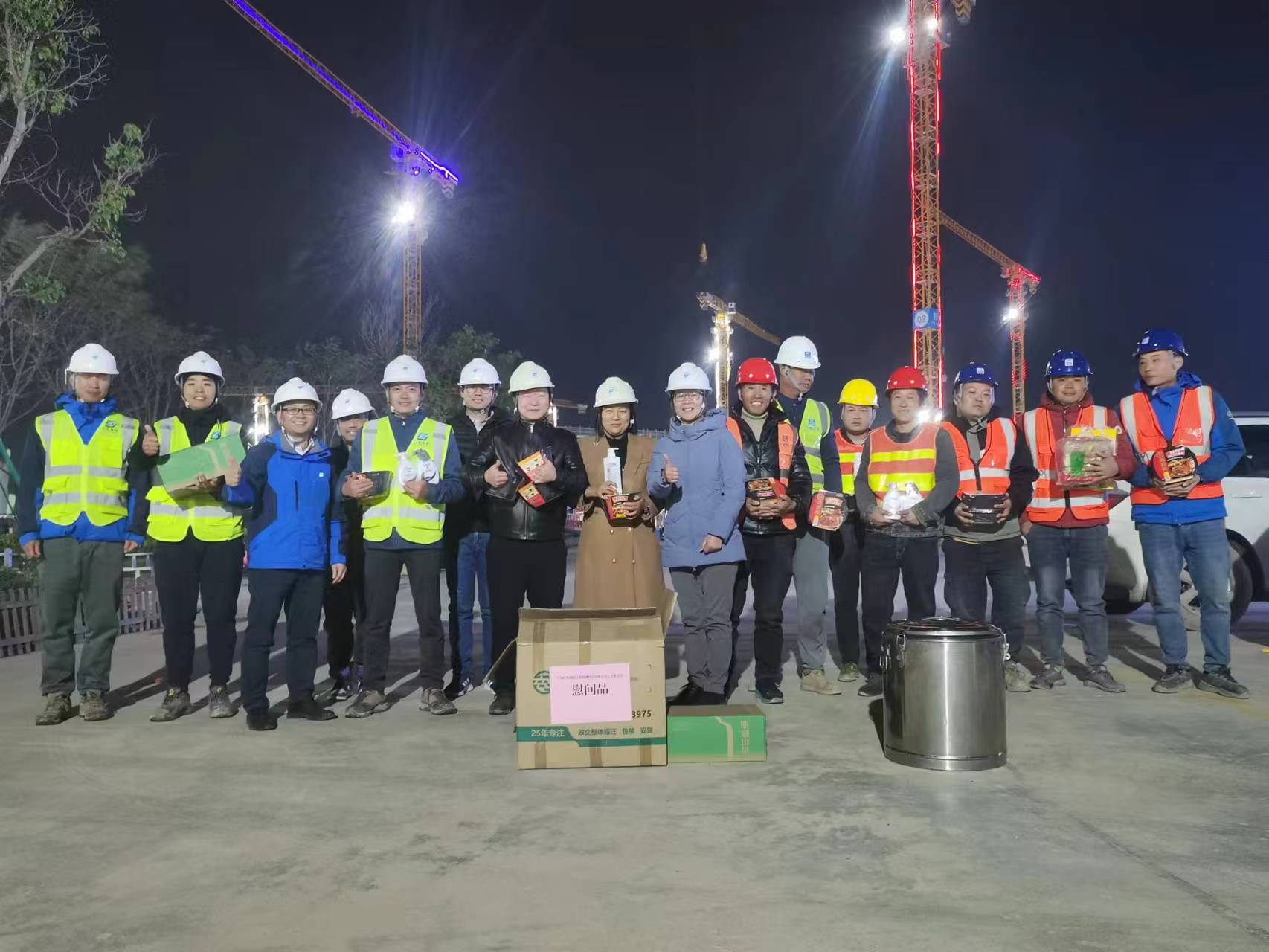 冬至前夜,在南沙全民文化体育综合体项目现场,广检工程检测中心检测人员正奋战在工地一线开展基桩竖向抗压、抗拔和水平静载试验。他们收到了公司工会送来的冬日暖心礼——一大锅热腾腾的汤圆,以及防寒慰问物资。