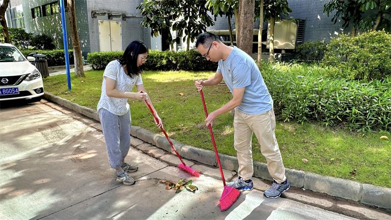 活动开始,在广质党总支委员、广质第一党支部书记、广质院副院长/广质公司副总经理付佳的带领下,党员们早早集结在园区前,携带清洁工具,个个精神抖擞、干劲十足,对园区内的垃圾落叶进行全面清理。大家分工协作,经过努力,园区环境焕然一新。