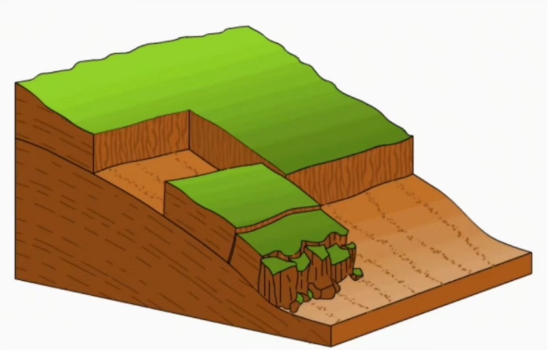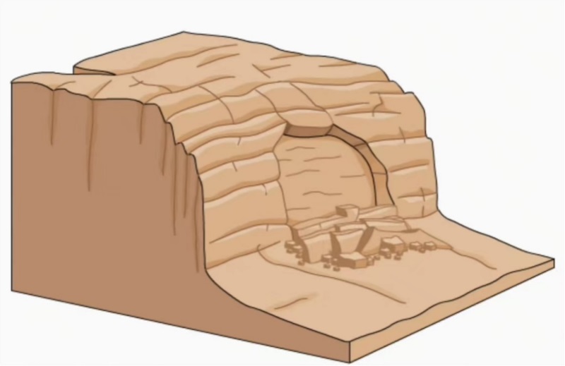 第五种是崩塌,这种破坏方式多发生在陡峭的岩质边坡,