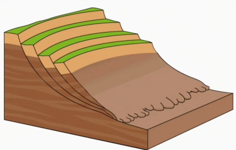 第四种是流动,多发生在土层较差的边坡,连续强降雨导致边坡下滑力增大,引发滑坡