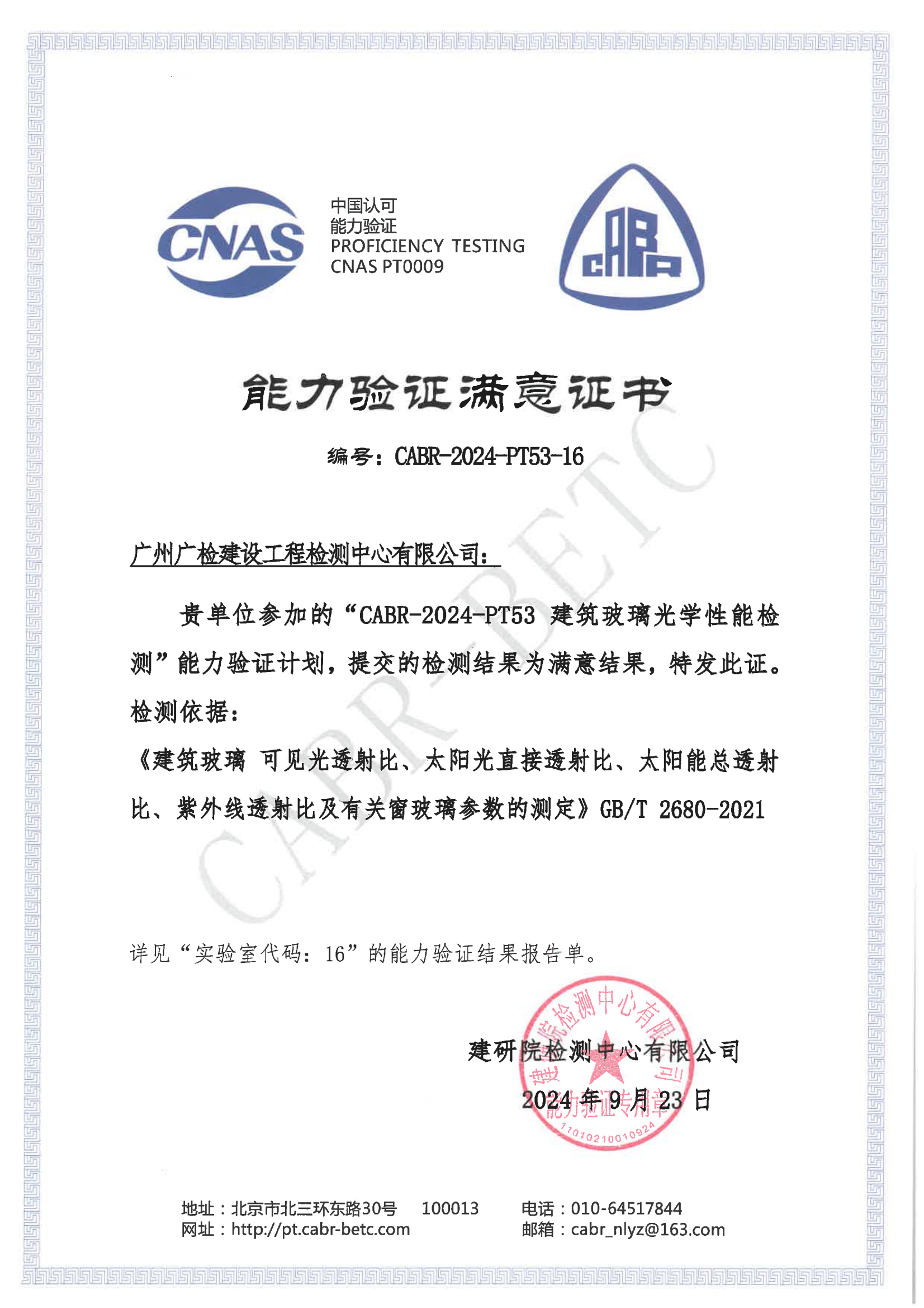 近期,广检工程检测中心顺利完成了由建研院检测中心有限公司发起的的建筑玻璃光学性能检测能力验证活动,并取得满意结果。此次活动旨在检验和提升团队的专业能力,为客户提供更加优质、准确的服务。