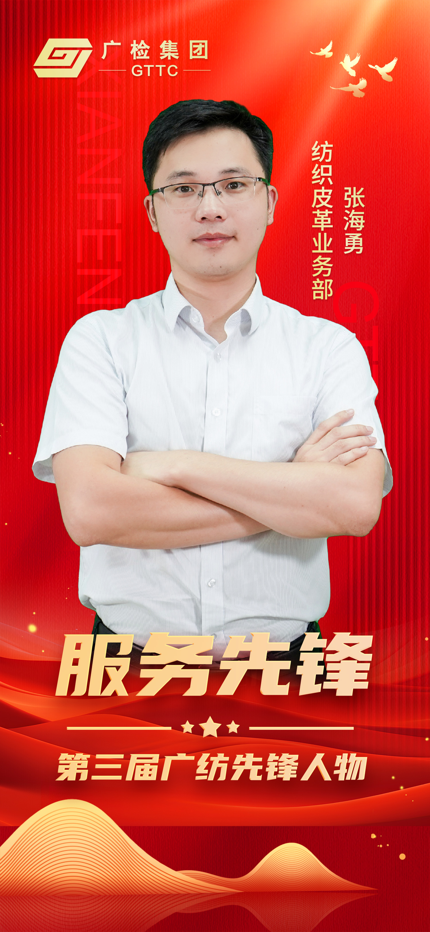 张海勇,中共党员:细致入微显真诚,好客之道共长云。他始终牢记“共赢发展、塑造行业引领者”的企业愿景,以政策为引领、市场为导向,聚焦行业高质量发展,持续提升服务的高度,致力解决企业客户防疫产品、纺织服装及箱包、鞋等业务问题,帮扶服务企业超300家,获得广东省产品质量技术帮扶“优秀帮扶专家”称号。他以精细优质的服务质量赢得客户信赖,不断打破工作边界,持续拓宽服务的广度,主导制定了首份家纺痛点《被类产品 静音性能的检测及评价》解决方案,合理评价羽绒被的静音性能,得到头部家纺品牌的一致认可。他以精湛卓越的技术创造非凡业绩,依托广检新领域新能力、质量案例剖析、标准培训解读,持续挖掘服务的深度,助力企业客户打造“5A”级高品质鹅绒服,提供“一站式”中外标准法规服务,量身定制20余项质量投诉解决方案,组织超50场次专题培训,获得企业客户的高度评价,在平凡岗位上为传统行业的出新出彩贡献力量,多次被评为优秀员工。