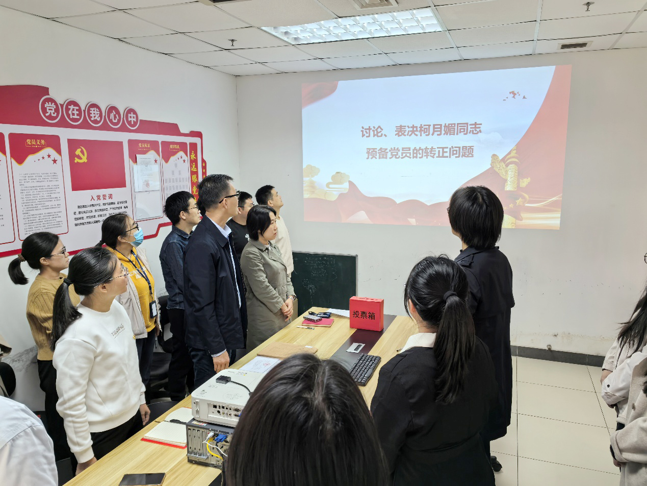 随后,大会讨论了柯月媚同志的转正问题。柯月媚同志宣读了转正申请书,详细汇报了在预备期间的思想、学习、生活和工作上的表现,表明转正态度和坚定不移跟党走的决心。经支委会介绍、党员讨论、预备党员表态以及党员投票表决,最终一致同意柯月媚同志按期转为中共正式党员。