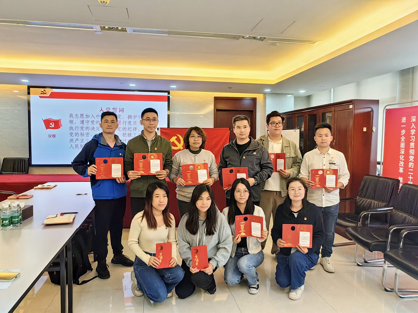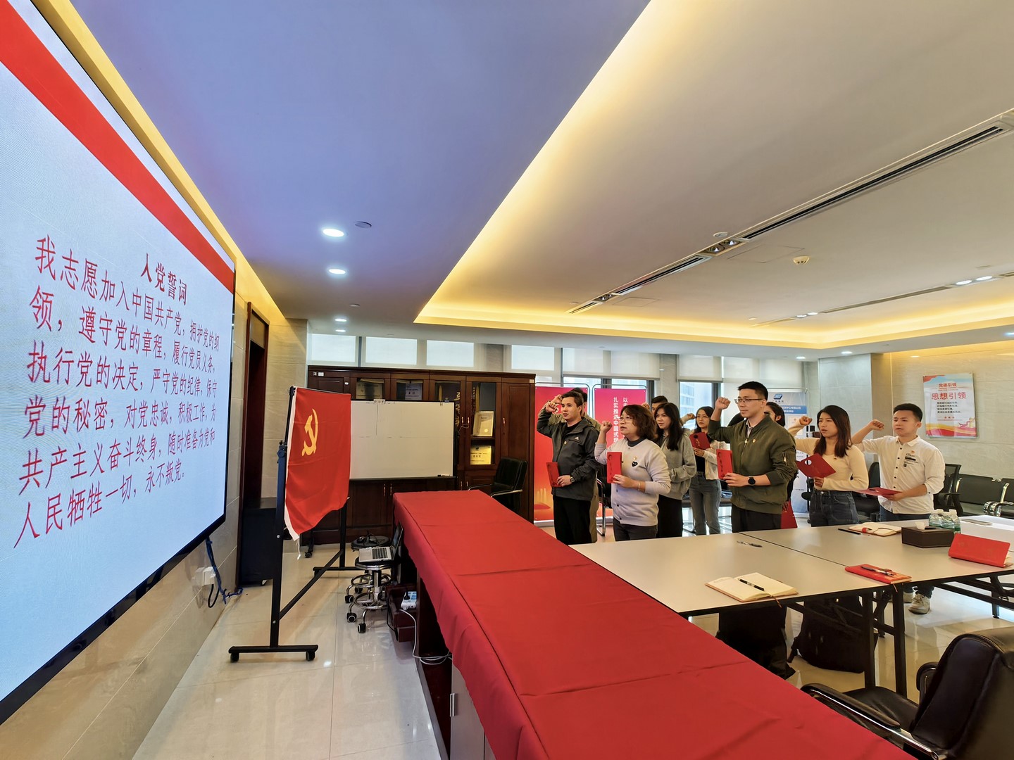 座谈结束后,穗粮公司党支部和广质第二党支部共同开展集体过“政治生日”活动。活动上,广质第二党支部书记莫锡乾和穗粮公司党支部书记欧阳琨同志共同为党员们送上“政治生日贺卡”。全体党员面向鲜红的党旗,举起右手郑重宣誓,重温入党誓词。通过过“政治生日”活动,进一步增强了全体党员的荣誉感和使命感,更让全体党员感受到了党的温暖和关怀。