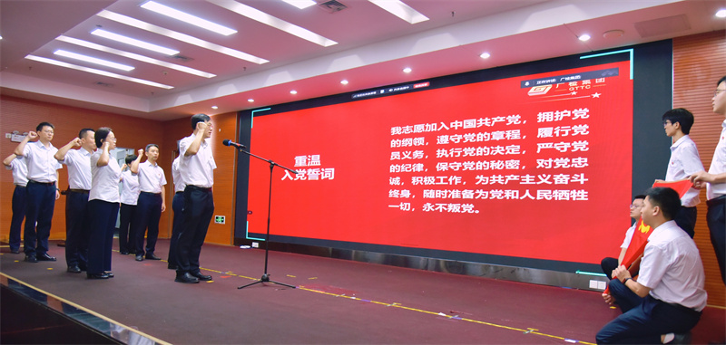 大会在庄严雄壮的国歌声中拉开序幕。集团党委书记、董事长蔡依军带领全体党员,面向党旗,重温入党誓词。铿锵有力的誓言在会场回响,彰显了广检党员不忘初心、牢记使命的坚定信念。